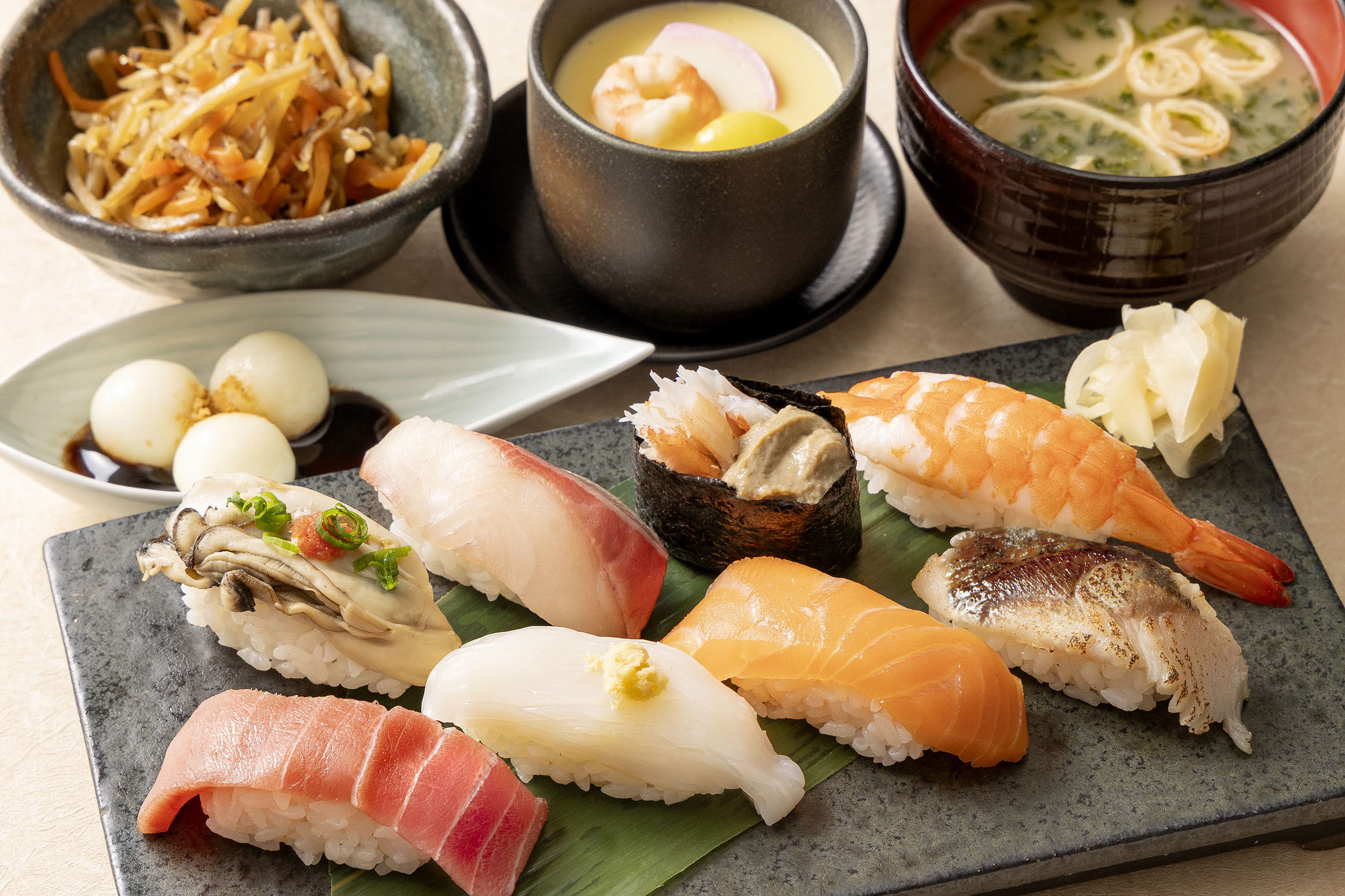 中とろ / ぶり / 炙りにしん / やりいか / えび(ボイル) / 蒸し牡蠣 / アトランティックサーモン / かにとかに味噌軍艦 / 茶碗蒸し / 小鉢 / 甘味 / 味噌汁