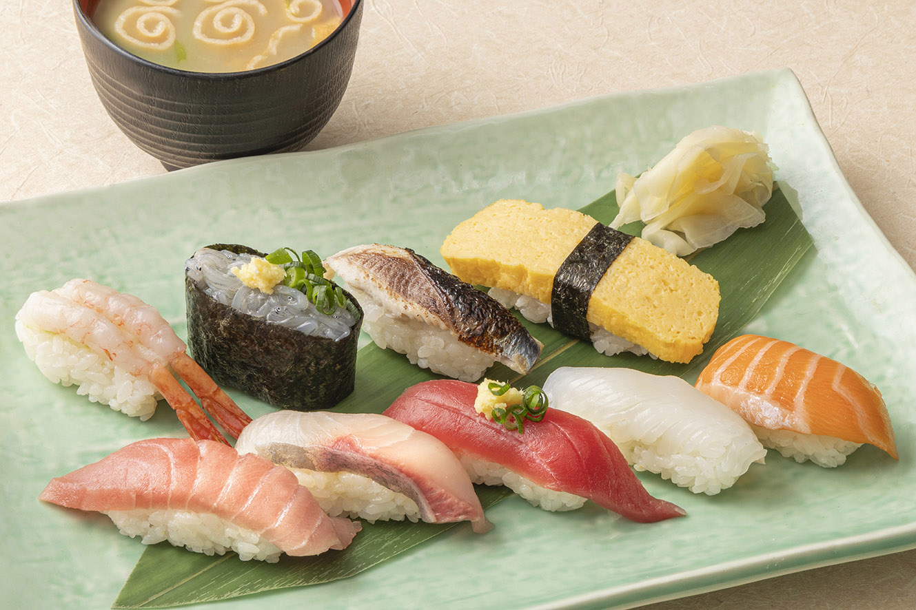 中とろ / ぶり(五島列島産) / 活〆かつお(宮城県産) / アトランティックサーモン / 炙りいわし / 甘えび / 紋甲いか / 玉子 / 生しらす軍艦