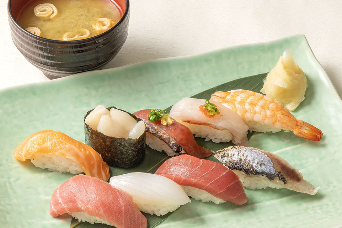 中とろ / 赤身 / 天然ひらめ / 炙りさんま / アトランティックサーモン / かつおのたたき / えび(ボイル) / 甲いか / いたや貝軍艦