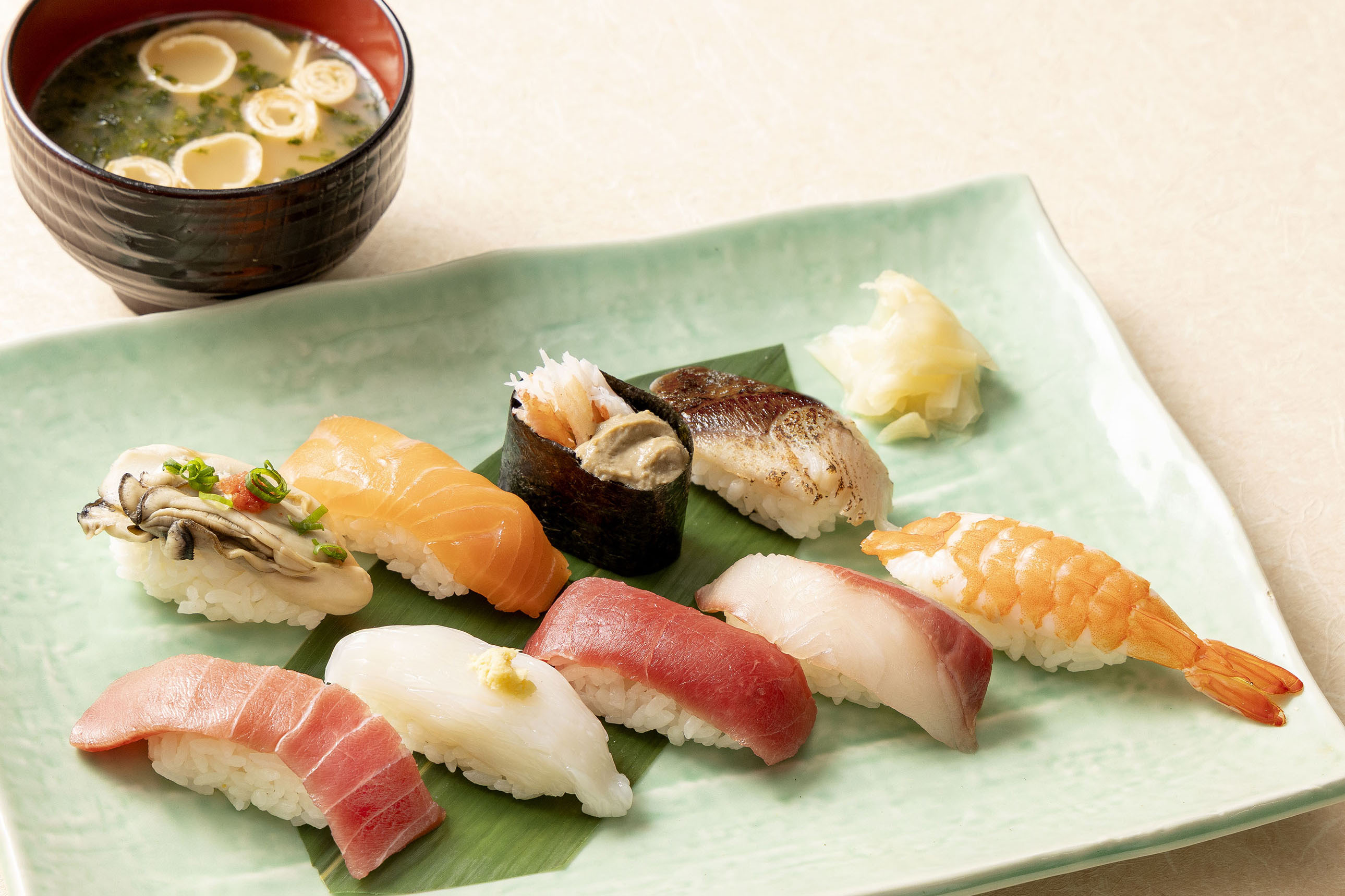 中とろ / 赤身 / ぶり / 炙りにしん / やりいか / えび(ボイル) / 蒸し牡蠣 / アトランティックサーモン / かにとかに味噌軍艦